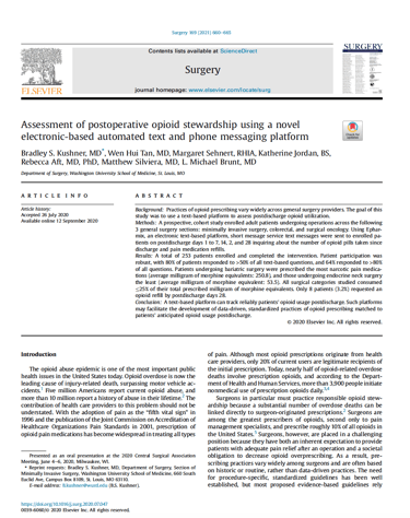 Methods: A prospective, cohort study enrolled adult patients undergoing operations across the following 3 general surgery sections: minimally invasive surgery, colorectal, and surgical oncology. Using Epharmix, an electronic text-based platform, short message service text messages were sent to enrolled patients on postdischarge days 1 to 7, 14, 2, and 28 inquiring about the number of opioid pills taken since discharge and pain medication refills.